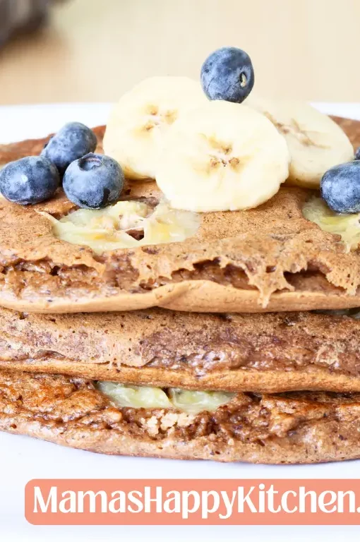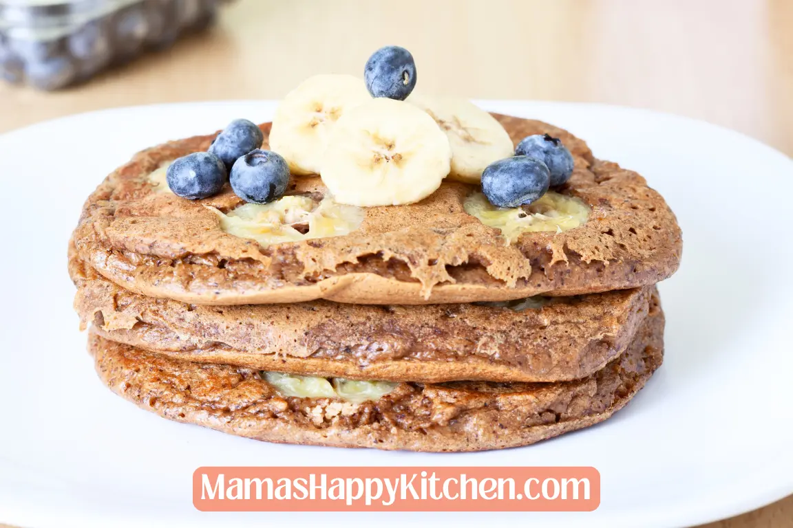 - Repeat step 4 for each pancake. Top with fresh fruit and serve with maple syrup, peanut butter, or jelly. Enjoy!