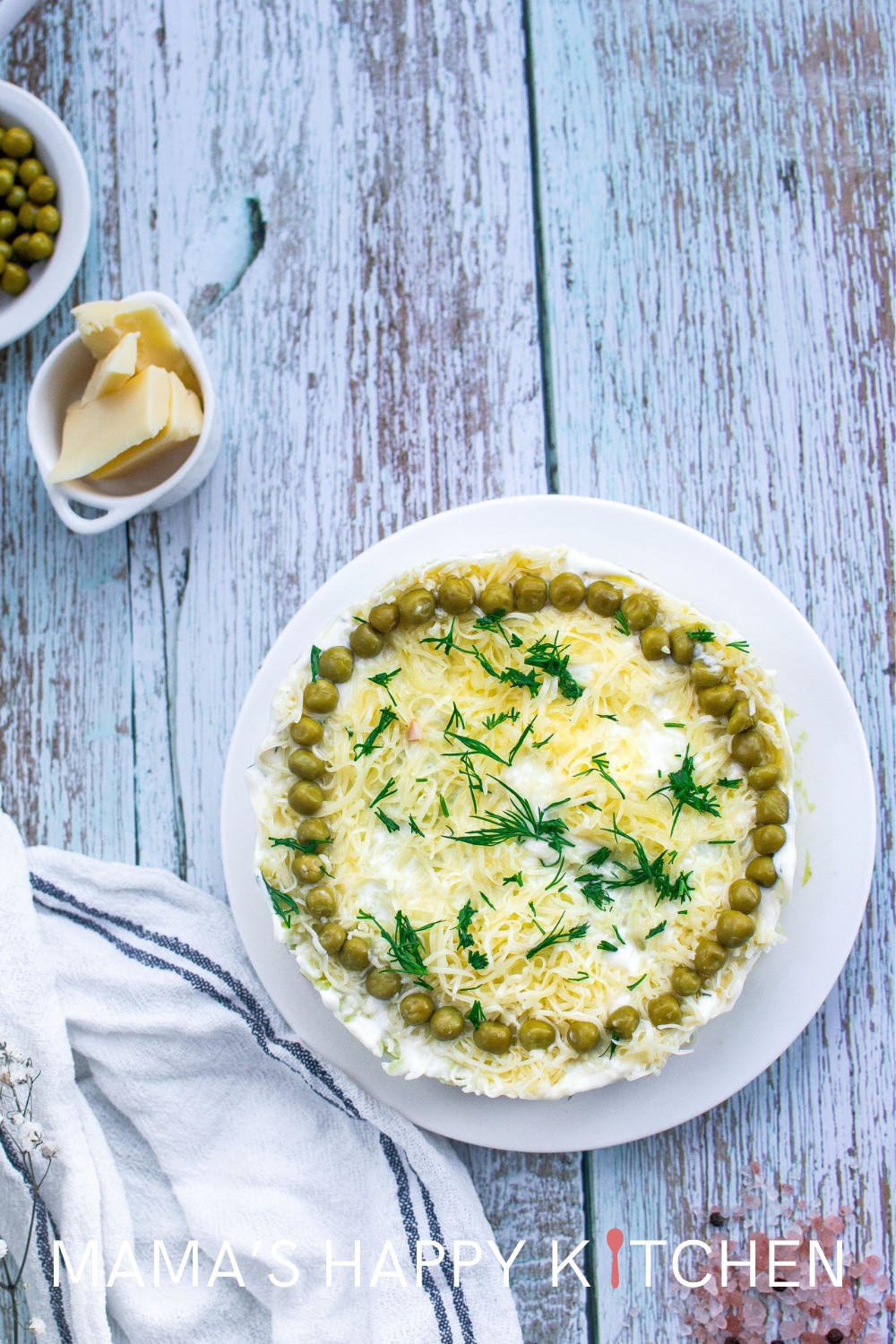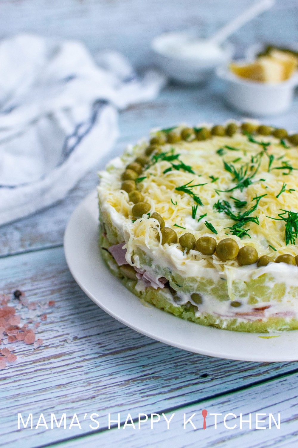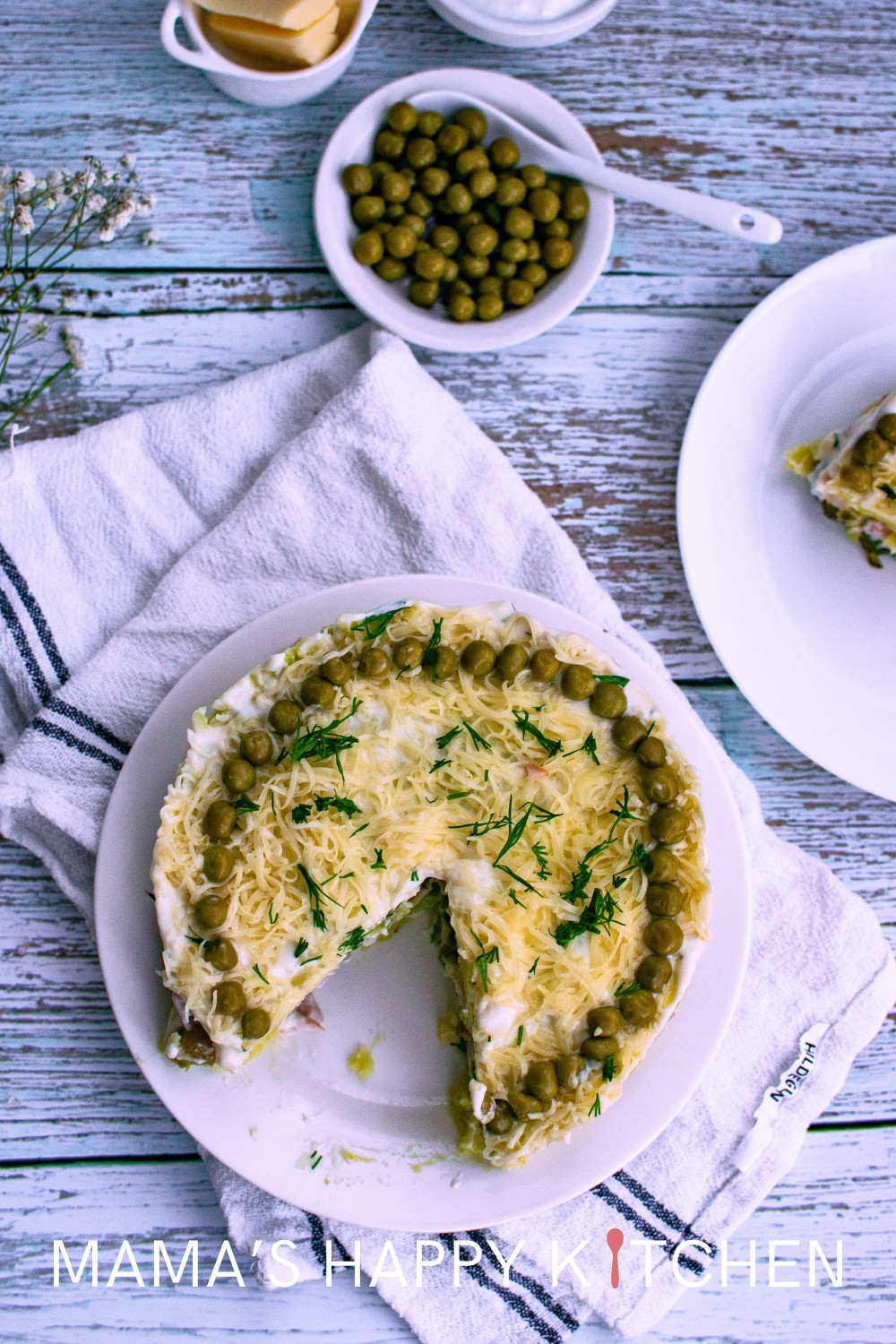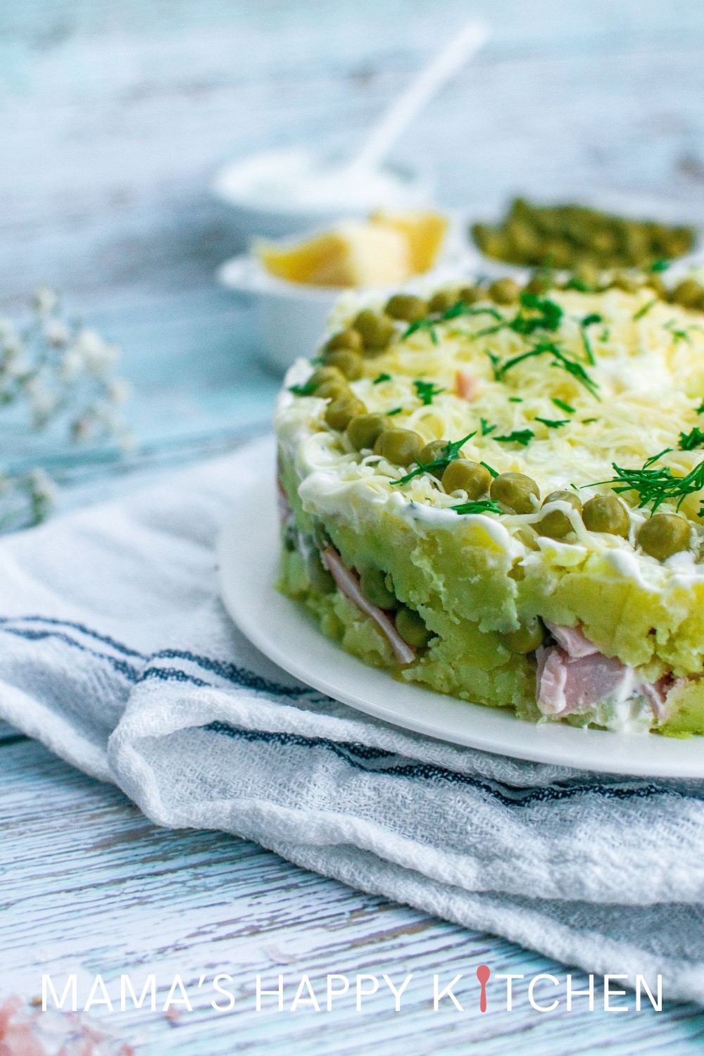 - Begin by layering the mashed potatoes at the bottom of the tin. Then spread a layer of the yogurt and mayonnaise mixture. Shred some pickles over this, sprinkle with peas, and add the cheese and egg mixture. Repeat the layers.