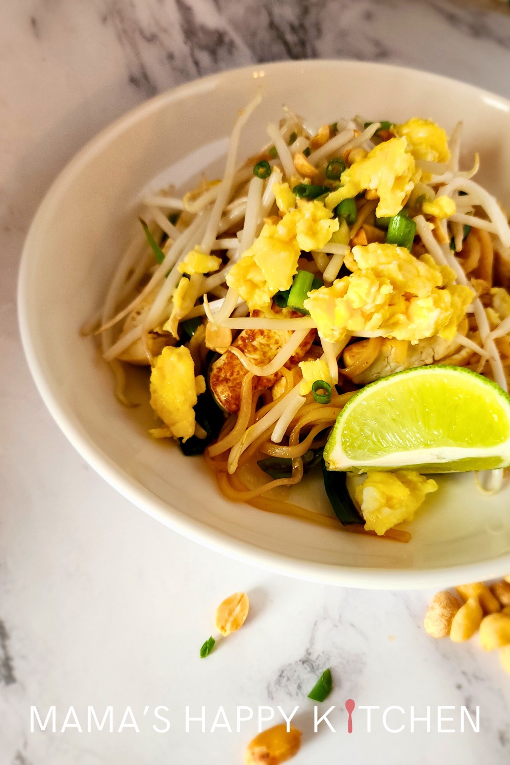 The Kid has been a vegetarian for several years, so I created this vegetarian tofu Pad Thai recipe for her. It features pan-fried, crispy tofu sautéed in sesame seed oil, with all the traditional Pad Thai accompaniments. It’s totally delicious, and I think you won’t even miss the meat in it. This recipe is great for meatless Monday, or anytime that you want to sneak some healthy, vegan proteins into your diet. If you want to make it 100% vegan, then omit the scrambled eggs and fish sauce.