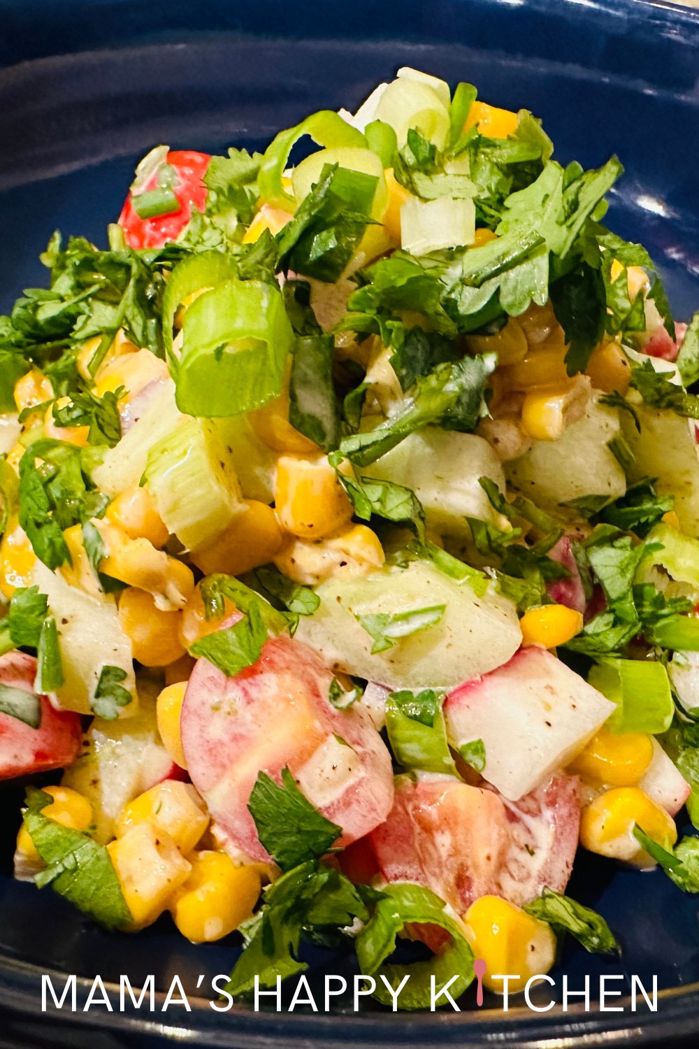 I love tacos. But tacos are quite unhealthy for you (so are empanadas btw). So I created this festive Mexican-inspired corn salad recipe when I want a little bit of Mexican flavor in my life without the unhealthy. It combines the freshness of corn with the tanginess of lime. This salad is perfect for that summer BBQ bash. The dressing is light and tangy. It’s also very easy to make … just heat up the corn and dice (or shred) the other ingredients.